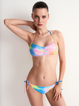 Лиф с эластичными завязками на шее и спине изящно подчеркивает грудь благодаря подвижным треугольным чашкам на кулиске. Формованные уплотненные съемные вкладыши позволяют создать дополнительный объем и эффект идеально округлой груди. Трусы «бикини» на тонких завязках с низкой линией талии открывают бедра и подчеркивают длину ног.