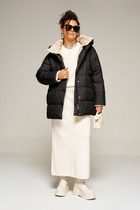 Застежка центральная на двустороннюю молнию от уровня груди до низа и кнопки по краю борта.