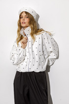 Куртка женская, свободного кроя с центральной застежкой на тесьму-молнию и кнопу-застежку на потайные кнопки. По переду прорезные карманы с втачной листочкой. Спинка присборена по низу на кулису. Рукав втачной, одношовный с застроченными складками от оката до низа по линии стяжки. Низ рукава присборен на резинку, по низу манжет из отделочной ткани-довяз. Капюшон с центральной частью и отделочной деталью по отлету, присборенной на кулису. В качестве отделки используется фурнитура. Наполнитель синтепон. Температурный режим до -10 градусов.