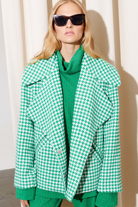 Жакет свободного кроя в стиле оверсайз, на подкладке. Воротник пиджачного типа с отложным воротником и лацканом, застёжка двухбортная на пришивной кнопке. Карманы в рамке. Жакет выполнен из нежнейшего, хорошо драпирующегося полотна с содержанием шерсти, которое не сковывает движения и в нём чувствуешь себя максимально комфортно.