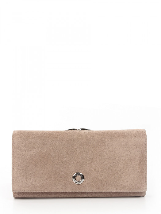 Кошелек женский выполнен из натуральной замши и натуральной кожи. Детали: основное отделение на магнитных кнопках, 3 отделения для купюр, 8 отделений для визиток или карт, 1 отделение с прозрачным окошком для карты или проездного, 1 отделение на молнии для купюр или мелочи, 1 отделение на замке фермуар. Фурнитура серебристого цвета. Упаковка: фирменная белая коробка.