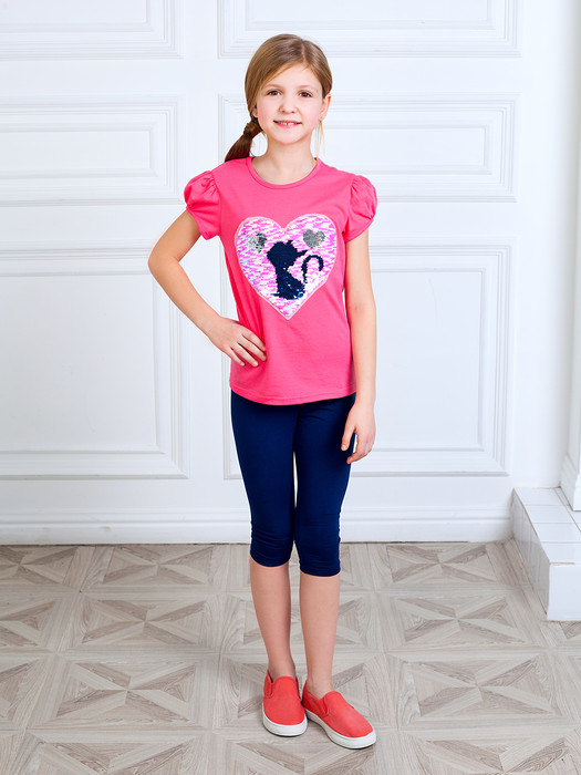 Изделие из кулирки не стесняет движений,что немаловажно для летней детской одежды,в ней комфортно в жаркое время года.Украшением костюма служит аппликация из двойных пайеток.Велосипедки изготовлены из эластичного трикотажного полотна.