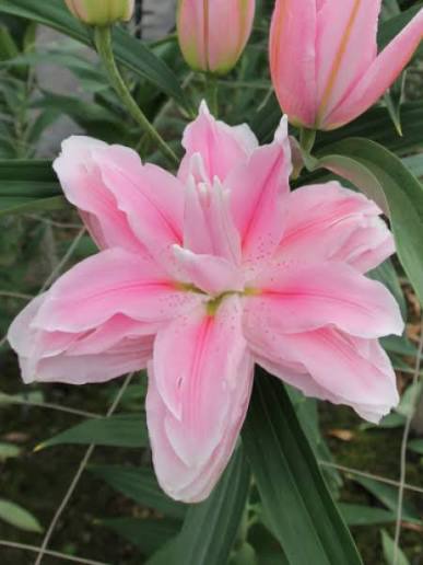 Цветок — густомахровый, кремово-розоватый с розовым напылением вдоль центра лепестков