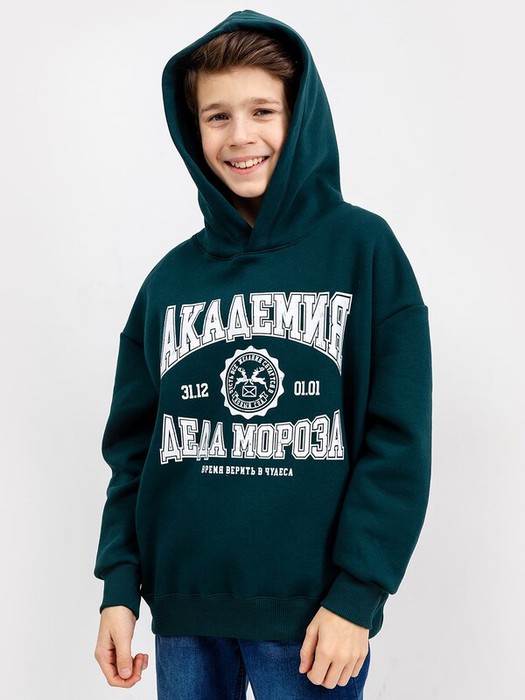 Анорак изготовлен из трикотажного полотна футер. Анорак свободного силуэта (оверсайз), с капюшоном. Горловина округлой формы. Капюшон со средним швом, на подкладке из осн. полотна. Плечо спущено, рукав втачной длинный. По низу рукава отрезная манжета из рибаны.