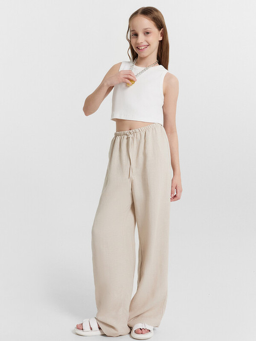 Брюки для девочек прямиго силуэта. Средняя посадка, пояс отрезной с эластичной тесьмой внутри 20RV. В поясе пробиты петли и втянут шнур из основного полотна.  Низ обработан швом в подгибку.