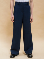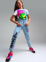 Брюки для девочек, с высокой посадкой, прямого силуэта. Пояс цельнокроеный с эластичной тесьмой внутри 30RV. Боковые швы с разрезами. Внизу, на боковом шве штанины расположено три бантика. Низ в подгибку