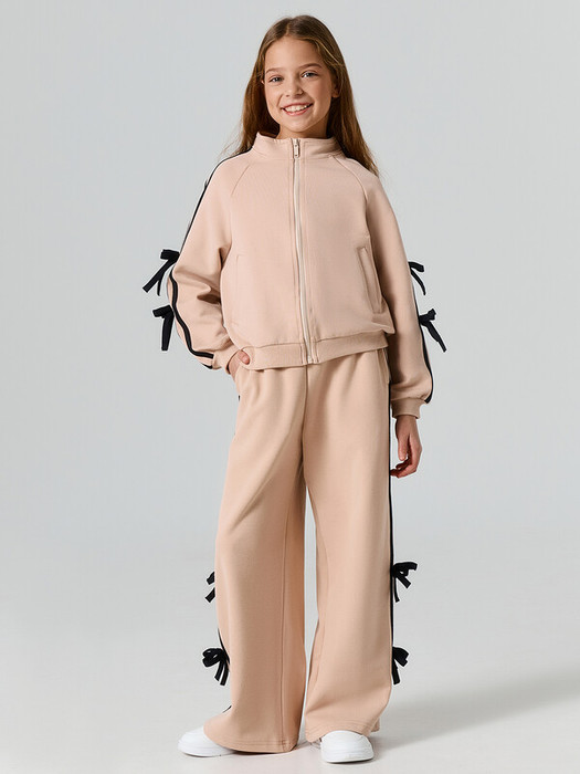 Брюки свободного силуэта с высокой  посадкой. Пояс цельнокроенный с эластичной тесьмой внутри 40/50RV (по размерам). По поясу сделаны 2 отделочные строчки. По боковому шву брюк настрочены лампасы и бантики из кулирки. Карманы в боковых швах, подкладка кармана из трикотажного кулирного полотна. Низ брюк обработан швом вподгибку.