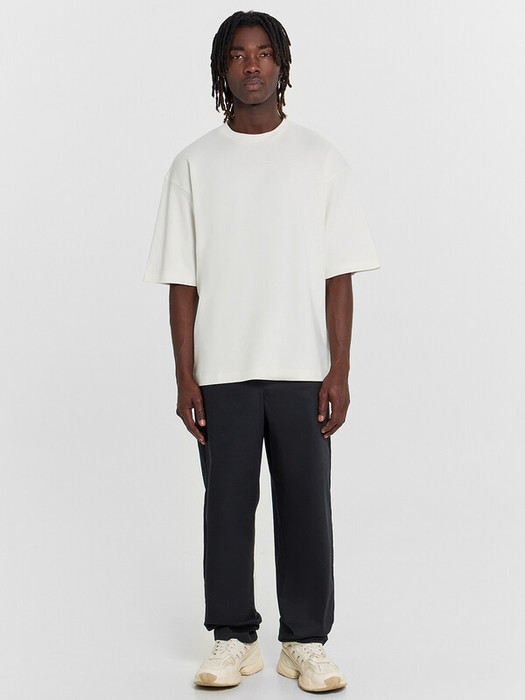 Брюки прямые, посадка средняя. Пояс цельнокроёный с эластичной тесьмой внутри. С внутренней стороны пробиты петли и втянут шнур с застроченными концами (10PXC-1). На левой детали переда имитация гульфика. По переду карманы с отрезными бочками. Нижние срезы брюк обработаны швом вподгибку. На деталях спинки накладные карманы.