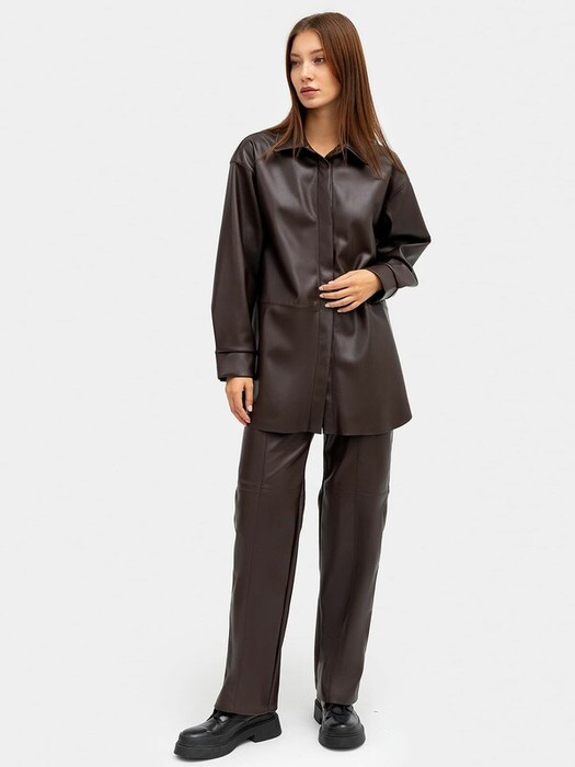 Женские брюки прямого свободного силуэта из экокожи. Пояс с эластичной тесьмой внутри, линия талии чуть завышена. Есть боковые карманы. На передней части модели – имитация гульфика, а также горизонтальные и вертикальные рельефные швы. Эти брюки вы искали!