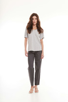 Свободные брюки женские прямого силуэта из смесовой льняной ткани. Пояс отрезной, из основного полотна. Центральная застежка на молнию с пуговицей. Карманы с отрезным бочком. На передней детали застрочена стрелка. На задней детали вытачки.