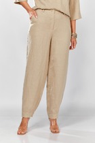 Брюки женские прямого силуэта из ткани. На деталях переда карманы с отрезным бочком. Пояс отрезной состоит из двух частей, задняя часть пояса присборена на резинку. Посадка средняя.