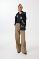 Брюки прямые свободные. Посадка средняя. Пояс цельнокроеный с эластичной тесьмой внутри. С внешней стороны пояса пробиты петли и втянут шнур. В боковых швах обработаны карманы. Подкладка карман из основного полотна. Нижние срезы обработаны швом вподгибку.
