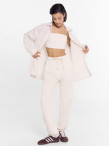 Брюки изготовлены из трикотажного полотна футер. Брюки прямые с высокой посадкой. Пояс отрезной из рибаны с эластичной тесьмой внутри. В передней части пояса с лицевой стороны пробиты петли и втянут шнур. Шов втачивания пояса распошит. Спереди обработаны карманы хулиганы. По низу брюк отрезные манжеты из рибаны.