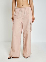Брюки с посадкой на талии свободного силуэта. Пояс цельнокроеный с резиной внутри 40RV подвернутый внутрь. Низ изделия обработан швом в подгибку.