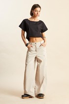 Брюки свободного силуэта с высокой посадкой в пол. Пояс цельнокроенный с эластичной тесьмой внутри 50RV. По поясу сделаны 2 отделочные строчки.