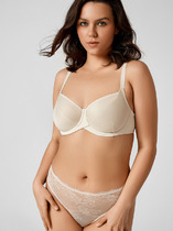Бюстгальтер с мягкими чашками, без каркасов, выполнен из эластичной сетки. Перед без подкладки, с горизонтальным и вертикальным членением, переходящий в бретель. Рельефные швы отстрочены. Срез горловины и проймы обработаны швом вподгибку с эластичной тесьмой внутри. В боковых швах пластины.Бочок из эластичной сетки. Верхний срез бочка обработан швом вподгибку, внутри с эластичной тесьмой. Бретель с регулировкой по длине. Кольца-регуляторы. Нижний срез окантован бейкой из эластичной сетки. Внутри эластичная тесьма. Застежка двойная.
