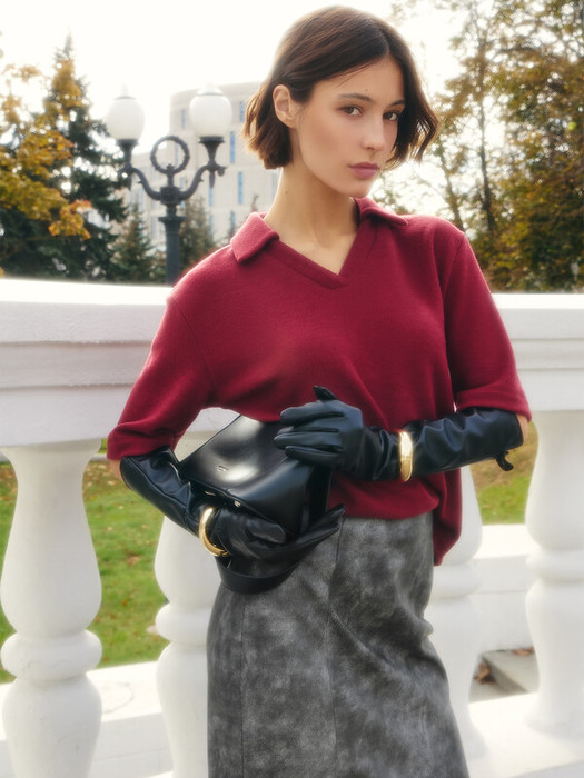 Джемпер прямого силуэта. Горловина V-образной формы со стояче-отложным воротником из основного полотна. Шов втачивания вортника по спинке закрыт тесьмой хб. Рукав втачной, короткий. Нижний срез джемпера и рукавов обработан швом вподгибку на 2х игольной плоскошовной машине.