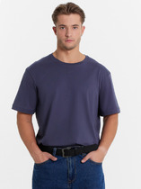 Футболка свободного силуэта. Перед и спинка цельнокроеные. Горловина круглой формы. Обтачка горловины из рибаны 1*1. По горловине проложена отделочная строчка. Горловина спинки закрыта тесьмой из основного полотна. Плечо спущено, пройма углублена. Рукав втачной, длина рукава чуть выше локтя.