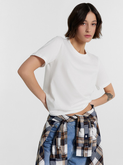 Футболка прямого силуэта. Горловина круглой формы обработана обтачкой из основного полотна. Рукава втачные, корткие. Нижние срезы футболки и рукавов обработаны швом вподгибку.