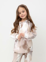 Худи для мальчиков, свободного силуэта (оверсайз), с капюшоном. Горловина округлой формы. Капюшон со средним швом, на подкладке из основного полотна. Плечо спущено, рукав втачной длинный, па рукаву настрочены лампасы. По низу рукава отрезная манжета из рибаны. Пояс отрезной из рибаны, отстрочен.