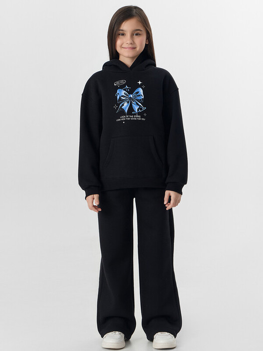 Худи для девочек, свободного силуэта (оверсайз), с капюшоном. Горловина округлой формы. Капюшон со средним швом, на подкладке из основного полотна. Шов втачивания капюшона закрыт хб тесьмой. Плечо спущено, рукав втачной длинный. По низу рукава отрезная манжета из рибаны. Пояс отрезной из рибаны, отстрочен. По переду карман кенгуру. Брюки для девочек, прямого силуэта. Пояс цельнокроеный с втачной эластичной тесьмой RV40. Пояс прострочен двумя отделочными строчками. По переду обработаны карманы в швах. Низ брюк обработан швом в подгибку на двухигольной плоскошовной машине.