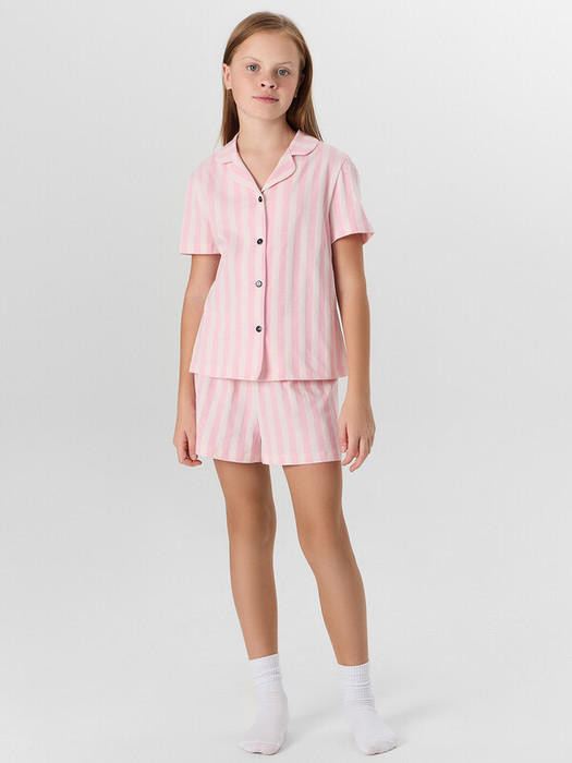 Комплект состоит из рубашки и шорт. Рубашка прямого силуэта, с отложным воротником, спинка цельнокроеная. Плечо слегка спущено. Рукав втачной, одношовный, короткий. Центральная застежка на пуговицы.
