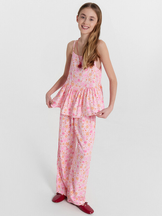 Комплект состоит из топа и брюк. Топ с узкими бретелями и с воланом на сборке по низу. Брюки прямые с цельнокроенным поясом. Внутрь пояса застрочена эластичная тесьма. Низ изделия обработан швом в подгибку с закрытым срезом.