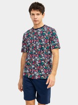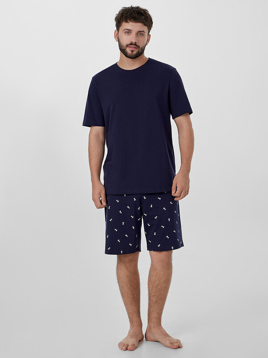 Пижама состоит из футболки и шорт. Футболка прямого силуэта. Горловина округлой формы обработана обтачкой из рибаны. Шов втачивания обтачки по спинке закрыт бейкой из основного полотна. Нижние срезы футболки и рукавов обработаны швом вподгибку.