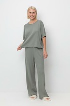 Комплект состоит из джемпера и брюк. Джемпер прямого силуэта. Горловина круглой формы, обработана обтачкой из основного полотна. Линия плеча спущена. Рукава длинные втачные . По низу рукавов отрезные манжеты из основного полотна. Низ джемпера обработан швом в подгибку на плоскошовной машине. Брюки прямые, свободные. Пояс цельнокроеный с эластичной тесьмой внутри (внутр. 40мм 40RV). По низу в шве подгибки эластичная тесьма (внутр. 30мм 30RV).