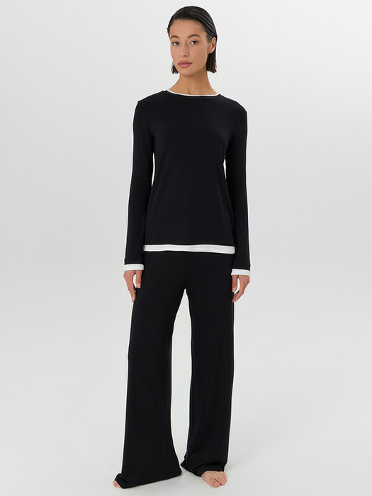 Невероятно комфортный домашний комплект от Mark Formelle. Лонгслив полуприлегающего силуэта создает элегантный и уютный образ. Круглая горловина подчеркивает классический стиль, а длинные рукава добавляют тепло и комфорт. Особую изюминку модели придают контрастные детали по краям, создающие эффект многослойности и визуально имитирующие поддетый джемпер.Брюки прямого свободного кроя обеспечивают удобную посадку, а эластичный пояс мягко прилегает, адаптируясь к индивидуальному размеру. Средняя посадка делает модель универсальной и комфортной для повседневного ношения. Нижний срез обработан швом вподгибку, что придает аккуратный вид. Комплект выполнен из эластичной вискозы — материала, который отличается мягкостью, гладкостью и приятной текстурой. Вискоза хорошо пропускает воздух, создавая ощущение легкости и комфорта при носке, а ее эластичность позволяет изделию идеально садиться по фигуре. Прекрасный выбор для расслабленного и уютного образа, который подойдет как для отдыха дома, так и для неспешных вечеров!