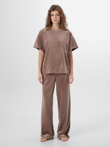 Джемпер прямого кроя с круглой горловиной и короткими рукавами не сковывает движения, а аккуратная обработка швов гарантирует комфорт. Брюки с высокой посадкой и широким эластичным поясом мягко фиксируются на талии, а практичные карманы-«хулиганы» добавляют функциональности.