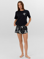 Женская пижама, состоящая из футболки и шорт, выполнена из натурального хлопка — дышащего, мягкого и приятного к телу материала, идеально подходящего для комфортного сна и отдыха. Натуральная ткань обеспечивает хорошую воздухопроницаемость и не вызывает раздражения, что особенно важно для чувствительной кожи. Футболка свободного силуэта с круглой горловиной и слегка спущенной линией плеча создает расслабленный и уютный образ. Свободные рукава не ограничивают движения, а аккуратная обработка низа рукавов и самого изделия швом вподгибку подчеркивает качество пошива и делает модель визуально завершенной. Шорты короткие, свободного кроя, с эластичным поясом, который обеспечивает комфортную посадку без давления. Низ шорт также обработан швом вподгибку, что придает изделию аккуратный вид. Пижама идеально подойдет для домашнего отдыха, сна или уютных вечеров, сочетая в себе легкость, комфорт и лаконичный стиль.