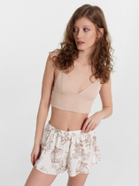 Шорты свободного силуэта, короткие. Пояс цельнокроеный, с втаченой эластичной тесьмой. Низ шорт обработан швом в подгибку.