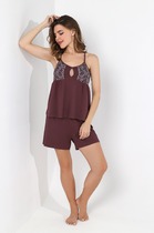 Комплект женский состоит из рубашки и шорт. Рубашка свободного силуэта, с отложным воротником. Рукав втачной короткий, линия плеча немного спущена, рукав обработан вподгибку. Рубашка с центральной застежкой с петлями и пуговицами. Низ застрочен швом в подгибку.