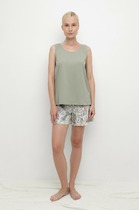 Топ женский прилегающего силуэта. Перед и спинка цельнокроеные. Верхний срез спинки окантован обтачкой, переходящей в бретели. Передний срез обработан эл тесьмой с зубом 8мм (артекс Е2699 КТЕ5-8). Низ топа обработан на микрооверлоке контрастной нитью.