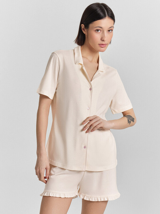 Эта красивая женская пижама свободного силуэта, выполненная из высококачественного хлопка, подарит вам комфорт на весь день и всю ночь. Горловина рубашки оформлена отложным воротником с лацканами, по краю которого проходит атласный кант, добавляющий изысканности и элегантности. Короткие рукава делают рубашку идеальной для теплой погоды, а центральная застежка на пуговицах обеспечивает удобство и стиль. Шорты свободного силуэта, декорированные рюшами по низу, добавляют образу очарования и женственности. Хлопковый материал обеспечивает легкость и приятные ощущения на коже, при этом пижама не жаркая, благодаря легкой и слегка тянущейся ткани, которая не сковывает движений. Эта модель подойдет как для сна, так и для домашних дел.