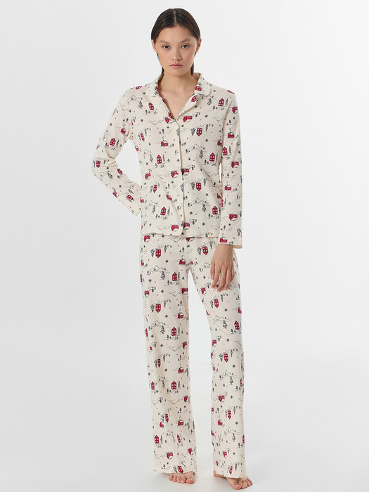 Бежевая пижама с зимним рисунком подарит вам ощущение тепла и уюта в холодные вечера. Этот очаровательный комплект состоит из удлиненного жакета и свободных брюк — идеальный выбор для спокойного сна и расслабленного отдыха.