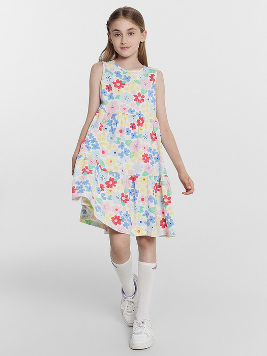 Платье без рукавов, выполненное из легкой трикотажной кулирки. Горловина круглой формы. Нижняя часть платья – с отрезными воланами. Рекомендуем вашей девочке!