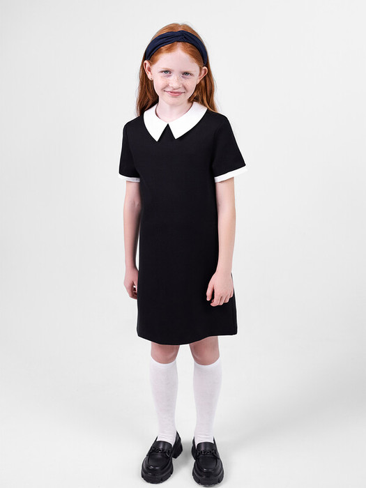 Платье полуприлегающего силуэта, длиной выше колен.  Перед и спинка цельнокроенные. Горловина круглой формы. Обработана воротником из текстильного полотна. По спинке застежка на молнию. Рукава короткие. По низу рукавов манжеты из текстильного полотна. Низ изделия обработан на 2-х игольной плоскошовной машине швом в подгибку.