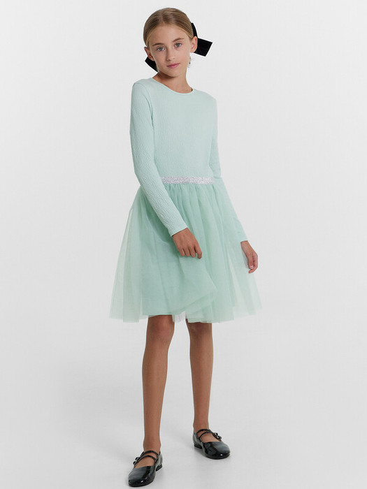Платье полуприлегающего силуэта с отрезной юбкой. Длина выше колена. Горловина круглая, окантована бейкой из основного полотна. Рукав втачной длинный. Низ рукава обработан на 2-х игольной плоскошовной машине. Юбка трехслойная на сборке. Верхние два слоя из трикотажного полотна сетки, подкладка из трикотажного кулирного полотна. Пояс из жаккардовой тесьмы
