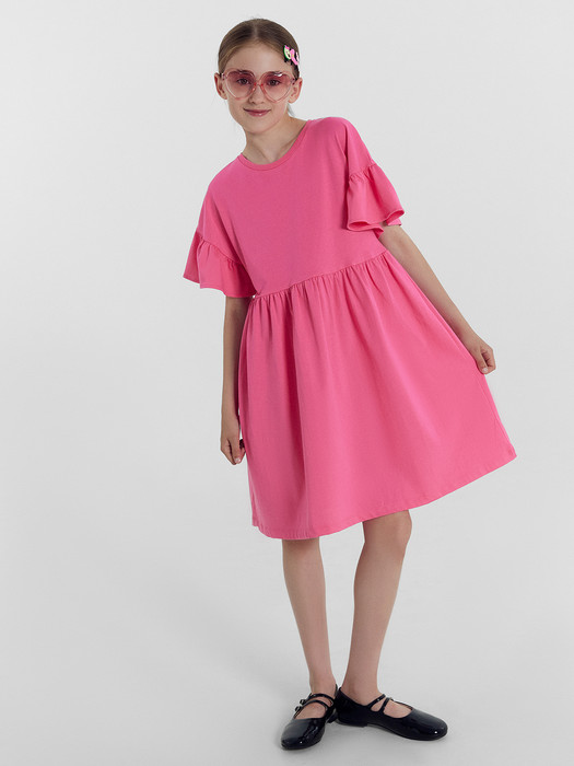Платье для девочек силуэта трапеция. Рукава короткие цельнокроеные. По низу рукавов притачана рюша из основного полотна. Края рюши обработаны узким швом вподгибку. Низ рюши рукавов обработан швом в подгибку. Горловина круглой формы обработана обтачкой из рибаны. Шов притачивания обтачки закрыт бейкой из основного полотна. Низ платья обработан швом вподгибку на 2-ух игольной плоскошовной машине.
