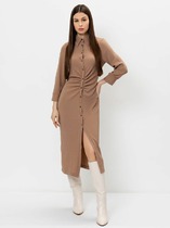 По переду центральная застежка на пуговицы. На деталях переда вытачки заложены в складки в области талии. На спинке средний шов с вытачками. Рукав втачной, длиной 3/4, с отрезной манжетой по низу рукава. Платье длиной ниже колена.