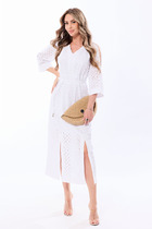 В правом боковом шве обработан разрез. Низ платья асимметричный.