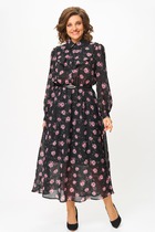 Платье прямое свободное, длиной миди. Горловина V-образной формы со стояче-отложным воротником. Плечо слегка спущено, рукав втачной, длинный. По низу рукавов отрезные манжеты с разрезами. Центральная застежка на петли и пуговицы. В боковых швах обработаны карманы. По бокам внизу обработаны разрезы. Нижний срез платья обработан швом вподгибку с закрытым срезом.