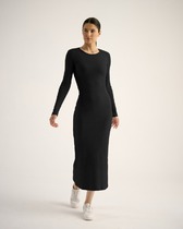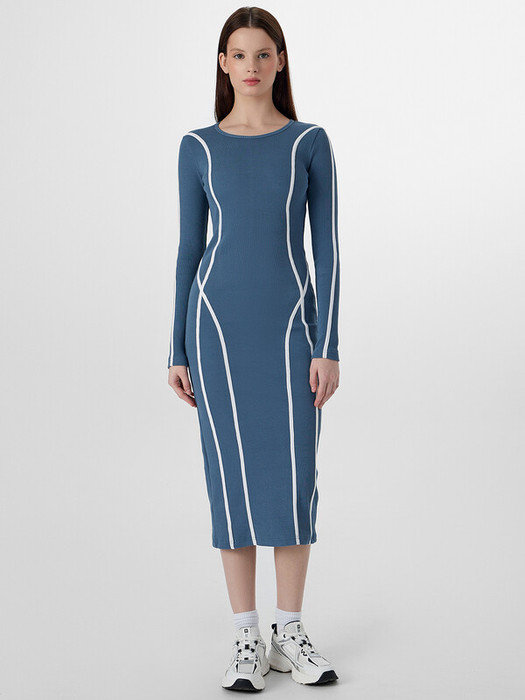 Платье женское прилегающего силуэта из рибаны. Длина миди. Рукава втачные, длинные. Горловина округлая, обработана обтачкой из основного полотна. По переду и спинке декоративные лампасы из кулирного полотна. Низ изделия и рукава обработаны швом вподгибку.