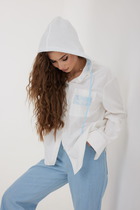 Горловина круглой формы с рубашечным воротником. Плечо спущено, пройма углублена. Рукав втачной, короткий. Низ рубашки прямой.