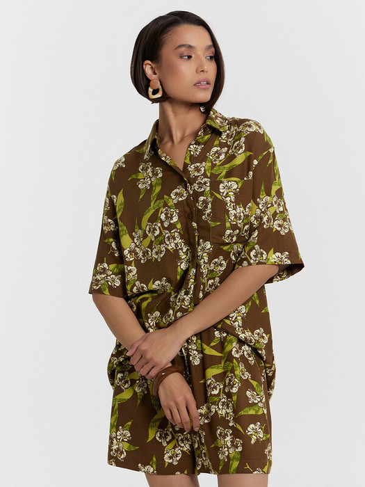 Эта женская рубашка — идеальное воплощение комфорта и стильного минимализма, созданное для расслабленных и элегантных образов. Свободный крой дарит легкость и непринужденность, позволяя чувствовать себя комфортно в течение всего дня. Модель выполнена из вискозы — натурального волокна, которое известно своей мягкостью и отличной воздухопроницаемостью. Оно приятно ощущается на коже, обеспечивая максимальный комфорт даже в жаркую погоду. Кроме того, вискоза отличается высокой прочностью и устойчивостью к износу, что делает рубашку долговечной и практичной. Классический рубашечный воротник и центральная застёжка на пуговицы подчеркивают строгую элегантность, а накладной карман слева на груди добавляет функциональности. Короткие рукава со спущенной линией плеча делают модель еще более расслабленной и удобной в движении, создавая стильный акцент. Эта рубашка станет универсальным элементом вашего гардероба, идеально сочетающимся с шортами, брюками или юбками. Завершите образ подходящими шортами из той же коллекции для создания гармоничного и легкого комплекта!