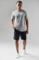 Шорты прямые, свободные. Пояс цельнокроеный с эластичной тесьмой внутри. С внешней стороны пояса пробиты петли и втянута хб тесьма.В боковых швах обработаны карманы, подкладка кармана из основного полотна. Нижние срезы брюк выполнены швом вподгибку на 2-игольной плоскошовной машине.