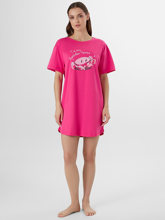 Ночная сорочка с нежным цветочным узором отличается продуманным кроем. Спущенное плечо и короткий рукав обеспечивают удобную посадку, а круглая горловина классической формы подчеркивает женственность. Длина выше колен идеальна для свободного движения.