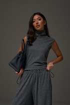 Перед с вертикальным и горизонтальным подрезом. Швы стачивания (плечевые, пройма, подрезы, пояс) распошиты. В боковых швах по низу обработаны разрезы.